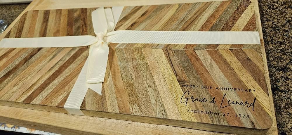 The Forever Etched Personalized Engraved Charcuterie Cheese Board Custom Cutting Board is the perfect gift for any special occasion! Whether you're looking for a unique housewarming gift, a sentimental wedding gift, or a thoughtful bridal shower, engagement or anniversary gift for a couple, this cheese board will not disappoint. The board is expertly crafted from high-quality woods in a stylish chevron pattern making it both durable and stylish. The surface of the board is engraved with a personalized design, adding an extra touch of sentiment and thoughtfulness to your gift. This custom cheese board is the perfect way to enjoy a delicious charcuterie spread with family and friends, making it an ideal choice for any celebration. This Charcuterie Board is not only ideal for displaying your favorite cheeses, but it also adds a touch of sophistication to your kitchen decor. Give a gift that will be cherished for years to come with this Personalized Engraved Charcuterie Cheese Board! Give a Christmas gift that will be used throughout the year at many happy gatherings. This cheese board serving tray makes a great holiday hostess gift, family gift or gift for a couple.